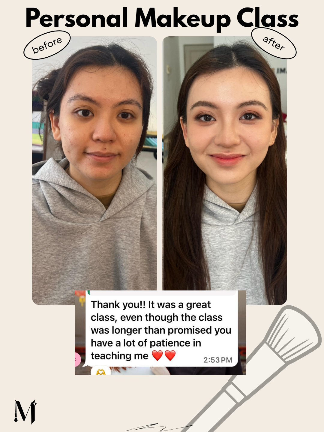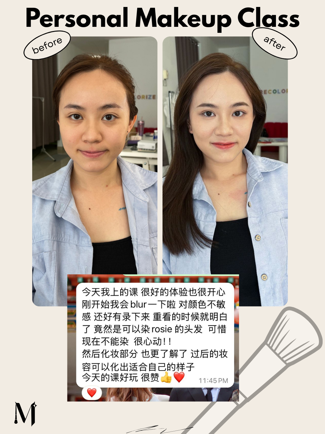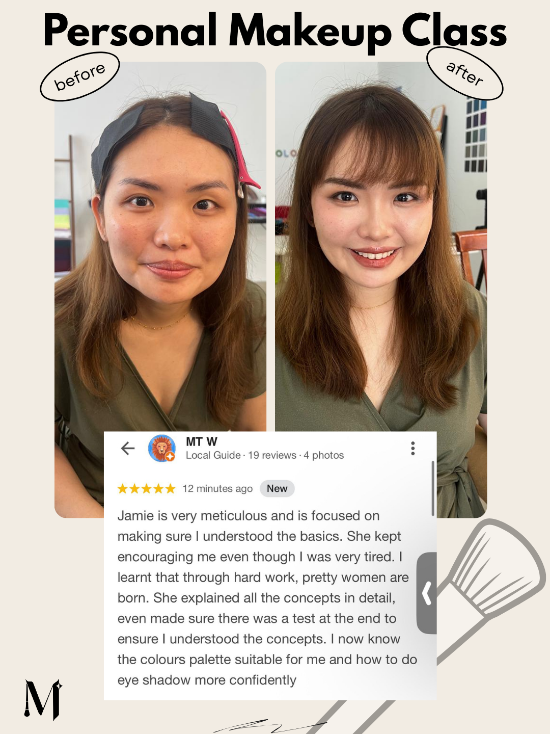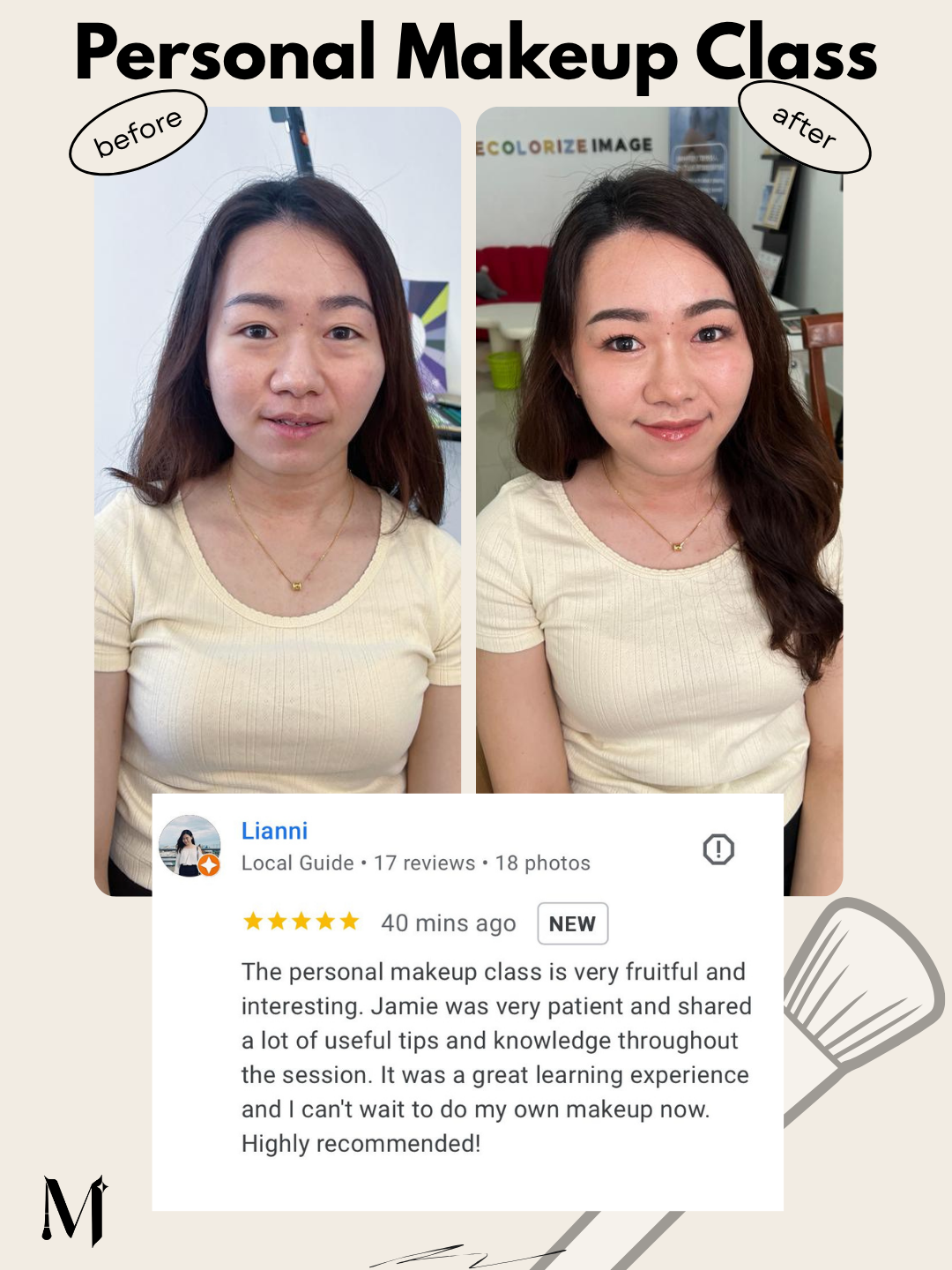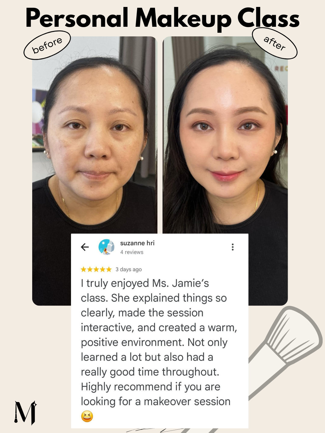 “The class was well-structured and coherent. Jamie is patient, professional, and adapts to different requests—whether you prefer Western or Asian looks. I learned so much in one session. Highly recommend for beginners.”