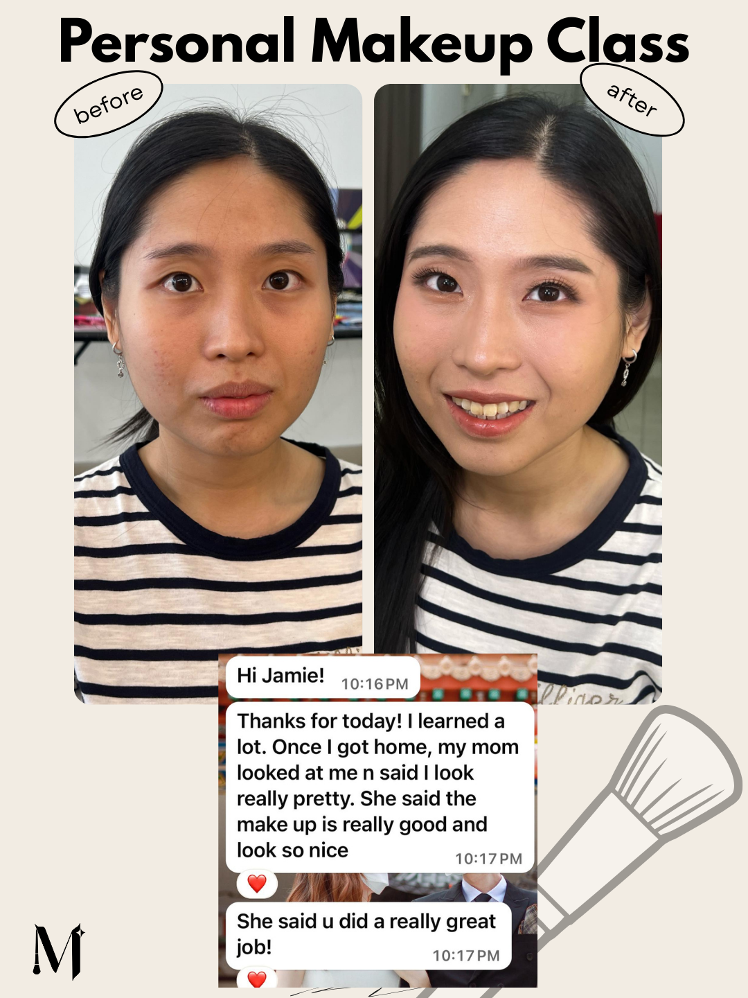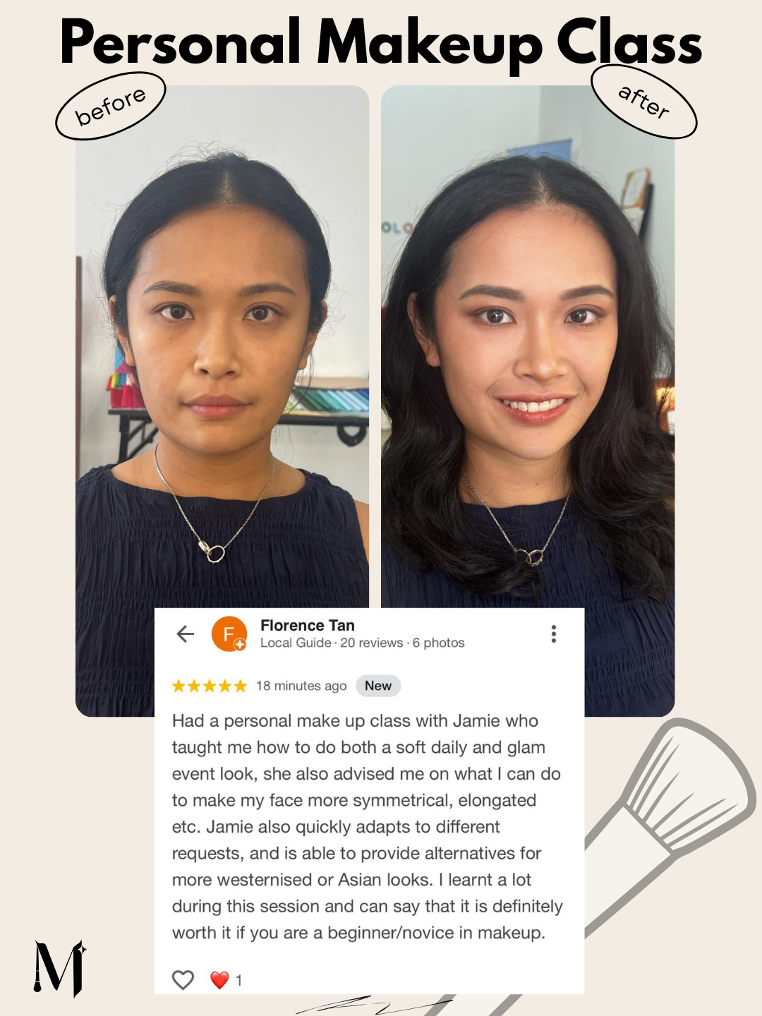 “Jamie taught me both soft daily and glam event looks, and gave advice on making my face more symmetrical. She quickly adapts to different requests. Definitely worth it if you’re a beginner or novice in makeup.”